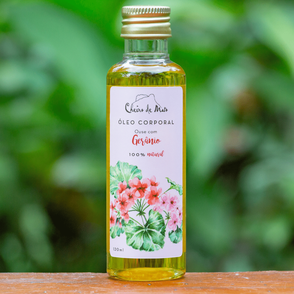 \nAo aplicar o Óleo de Gerânio da Cheiro de Mato, o aroma floral e suave envolve seus sentidos, transportando você para um jardim repleto de flores frescas. A textura leve e absorvível desliza suavemente sobre a pele, nutrindo e revitalizando sem deixar sensação oleosa. A cada uso, você sente a pele mais macia, firme e rejuvenescida, pronta para enfrentar o dia com conforto e beleza. Traz benefícios emocionais e mentais. Excelente para Massagens e auto massagem. \n
